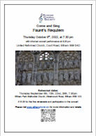 ![]() | Saturday 11th October 2014 The Autumn Concert – Come and Sing Conducted by Peter Asprey Soloists: Susan Ring, Soprano Roderick Tutt, Tenor Geoffrey Howard, Bass Organ: Charles Andrews | You were invited to Come and Sing in – or just come and listen to – two popular works, plus a surprise choral arrangement of an organ masterpiece. Fauré: Requiem Fauré: Cantique de Jean Racine Willcocks: Sing! (choral arrangement of Widor’s Toccata) Concert start: 6.00pm Eltham Park Methodist Church, Westmount Road, Eltham, SE9 1XX |