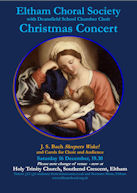 ![]() | Saturday 13th December, 2008 The Christmas Concert Conducted by Nicholas Jenkins Soloists: Soprano: Rebecca Bottone Baritone: Julian Empett Trumpet: Robert Wallace Organ: Charles Andrews | Michael Coe: And Unto Men Rejoysynge (ECS commission, 1982) Vaughan Williams: Fantasia on Christmas Carols And carols for Choir and Audience Concert start: 7.30pm Holy Trinity Church, Southend Crescent, Eltham, SE9 2SD |