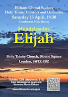 ![]() | Saturday 22nd March 2014 Mendelssohn: Elijah Conducted by Edward Gardner Eltham Choral Society Trinity Laban Singers with Blackheath Halls Chorus and Orchestra Soloists: Soprano: Ailish Tynan Mezzo: Louise Winter Tenor: Robert Murray Bass: Matthew Rose | Concert start: 7.30pm St John’s, Smith Square, , London, SW1P 3HA |