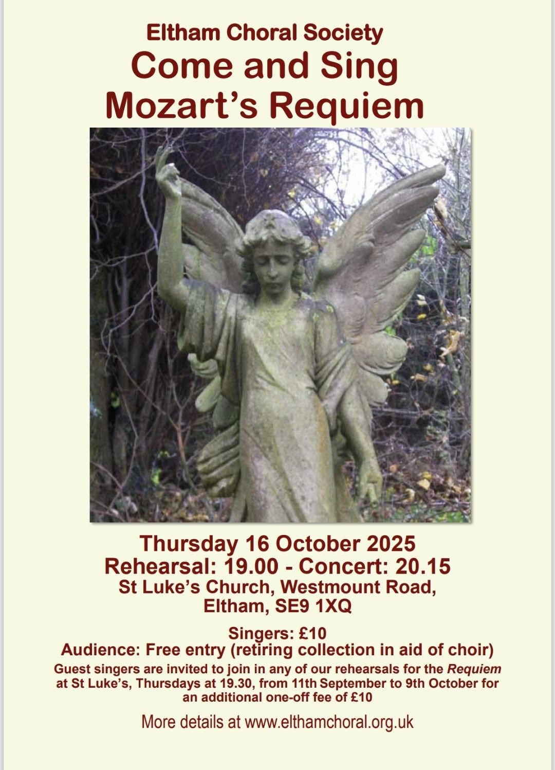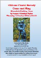 ![]() | Saturday 12th October 2013 Come & Sing – Mozart & Rutter Conducted by Peter Asprey Organ: Charles Andrews | Mozart: Coronation Mass Rutter: The Lord Bless You and Keep You Concert start: 7.00pm Eltham Park Methodist Church, Westmount Road, Eltham, SE9 1XX |