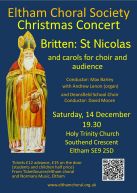![]() | Saturday 14th December 2013 The Christmas Concert Conducted by Peter Asprey Soloists: Tenor: Julian Forbes Young Nicolas: Naomi Morris The Pickled Boys: Elizabeth Reczek, Ella Richardson, Flora Tregear Semi-chorus from Trinity Laban Conservatoire of Music and Dance Organ: Charles Andrews & James Perkins Piano: Charles Andrews & Stephen Meakins and the Amadeus Orchestra | Britten: St Nicolas and carols for choir and audience Concert start: 7.30pm Holy Trinity Church, Southend Crescent, Eltham, SE9 2SD |