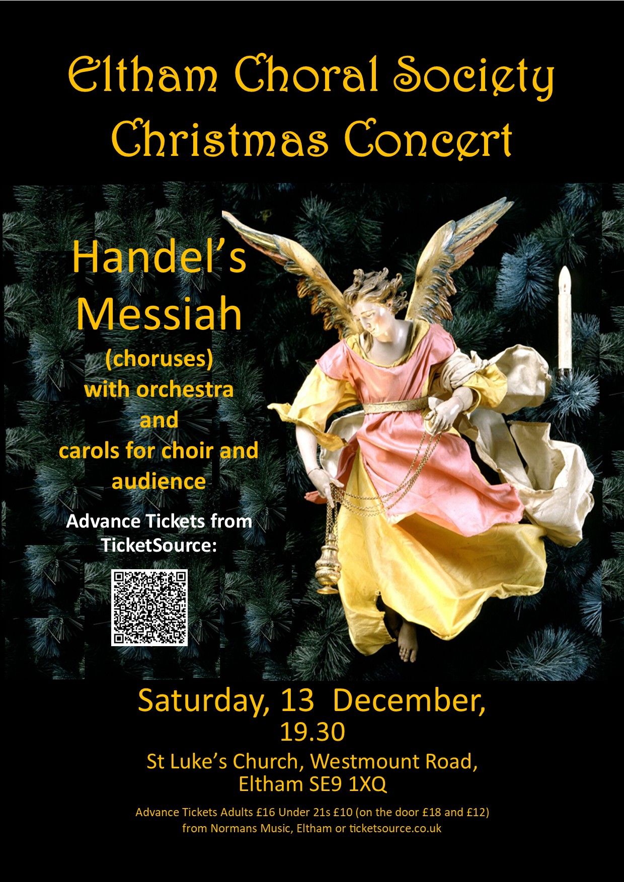 ![]() | Saturday 15 December 2018 The Christmas Concert Conducted by Max Barley Accompanist: Andrew Lenon Soprano: Sara Pay Alto: Lorna Perry Tenor: Harry Ross Bass: Jack Lee Soloists from the Choir: Pam Fanshawe, Helena Farquhar, Jo Marshman, Jill Pollock, Val Seaton, Sue Quirk | Handel: Messiah pt. 1 and Hallelulah Chorus Bach: Christmas Oratorio (excerpts) plus carols for choir and audience Concert start: 7.30pm, Doors open: 7pm Holy Trinity Church, Southend Crescent, Eltham, SE9 2SD |